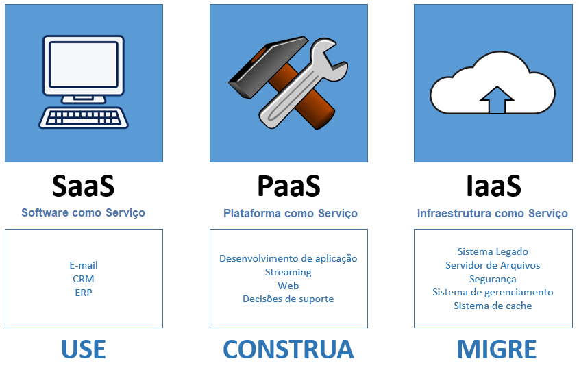 ° Tipos de serviços: Infraestrutura (IaaS), Plataforma (PaaS) e Software (SaaS).